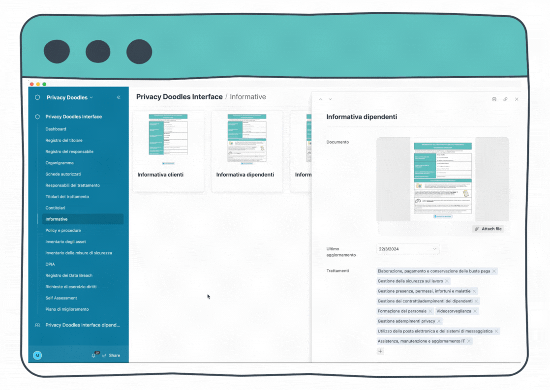 Archivia sulla piattaforma tutta la documentazione del sistema di gestione privacy. Condividila con il personale fornendo loro le credenziali di accesso ad un'area riservata. Ciascun autorizzato vedrà soltanto la sua scheda personale, le sue autorizzazioni, policy e procedure applicabili, informative privacy e le task assegnate.