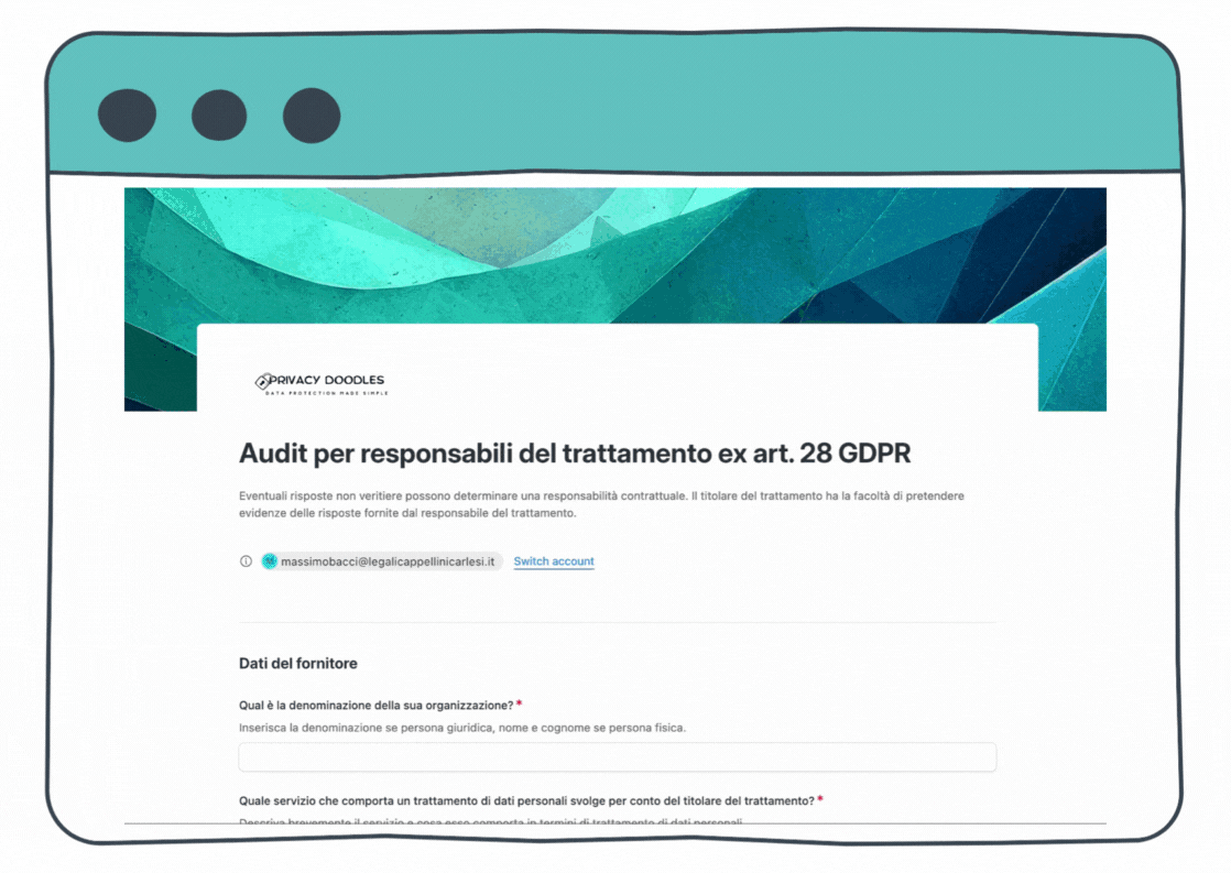 Assolvi gli obblighi di cui all'art. 28 del GDPR inviando ai tuoi fornitori dei form a risposta multipla, facili e veloci da compilare. Registra il risultato dell'audit nella scheda del responsabile del trattamento.