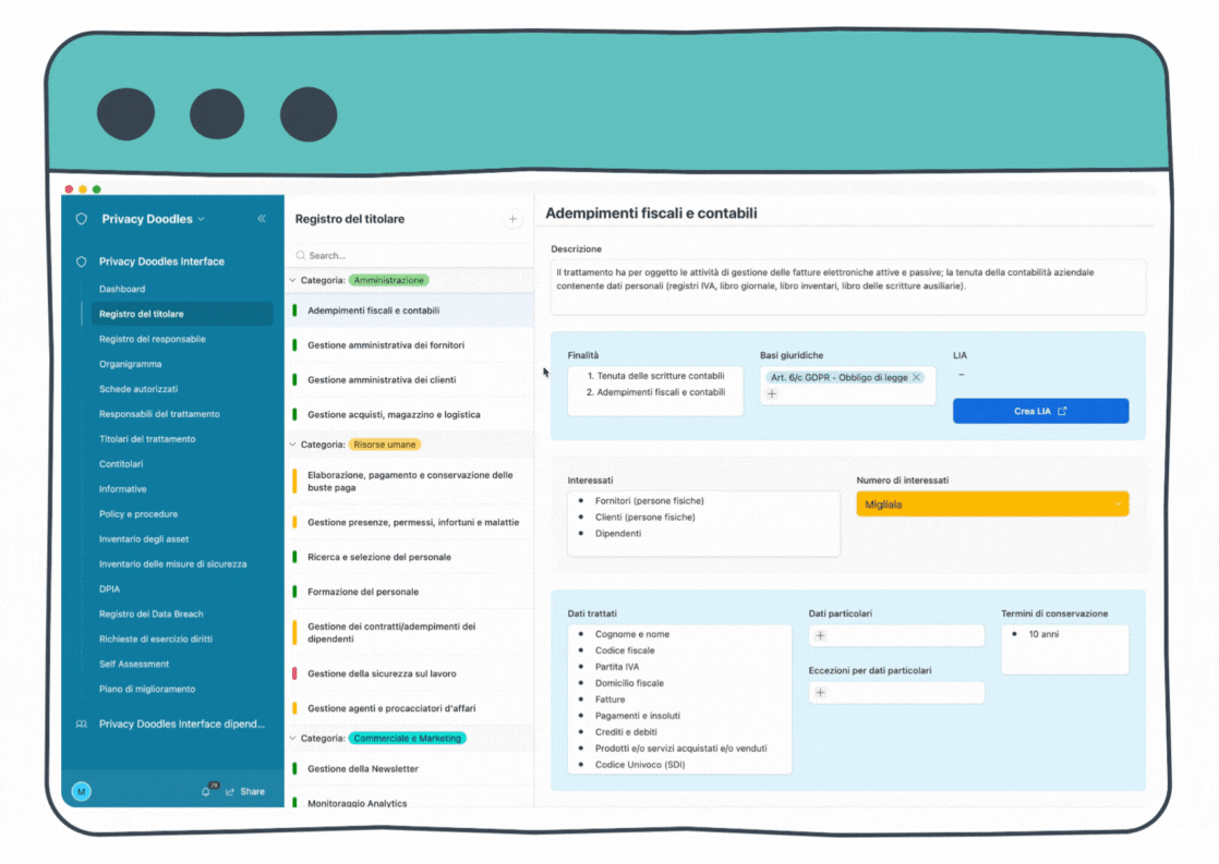 Mai visti dei registri così dettagliati ed allo stesso tempo facili da mantenere. Tutti gli elementi del sistema di gestione sono sincronizzati e confluiscono automaticamente nei registri (responsabili, autorizzati, asset, misure di sicurezza, analisi dei rischi, informative, LIA etc.). I registri sono navigabili: puoi cliccare un elemento (es. un responsabile o un asset) per aprire la sua scheda.